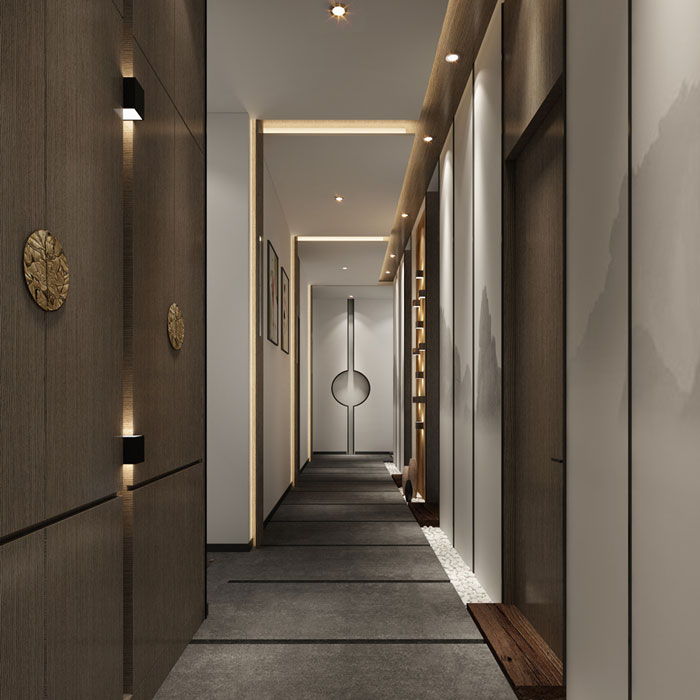 設(shè)計(jì)師選擇新中式風(fēng)格,黑白灰背景搭配原木色,對稱布局與時(shí)尚線條,還有富有質(zhì)感的凹凸紋理墻面與精心挑選了花紋大理石,讓整個(gè)空間充滿了一種水墨畫般柔和的光影變幻……符合含蓄秀美的中國女人味。